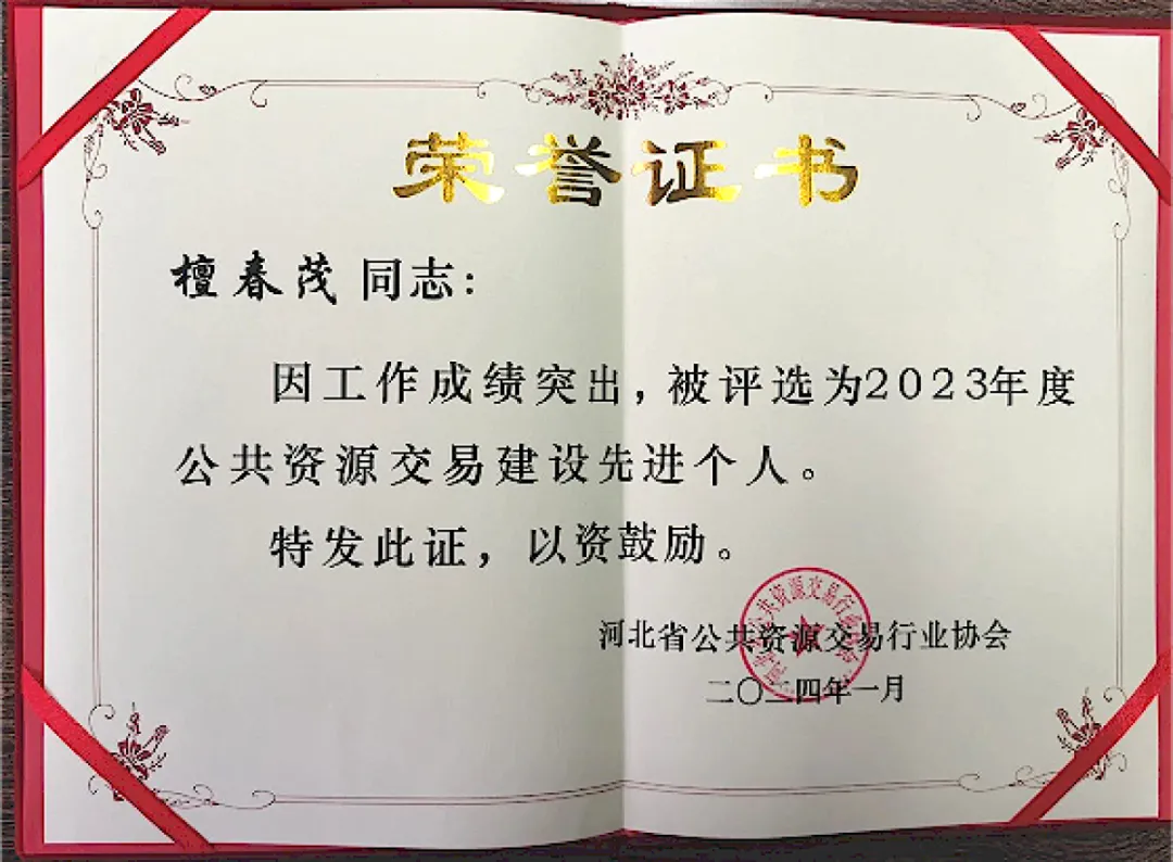 在會議上,河北CA及市場總監(jiān)檀春茂榮獲雙證書,分別為“優(yōu)質(zhì)服務機構(gòu)”榮譽獎牌和“公共資源交易建設(shè)先進個人”榮譽證書,這是對河北CA過去一年里積極參與河北省公共資源交易行業(yè)協(xié)會工作、助力河北公共資源行業(yè)高質(zhì)量發(fā)展的認可與鼓勵。